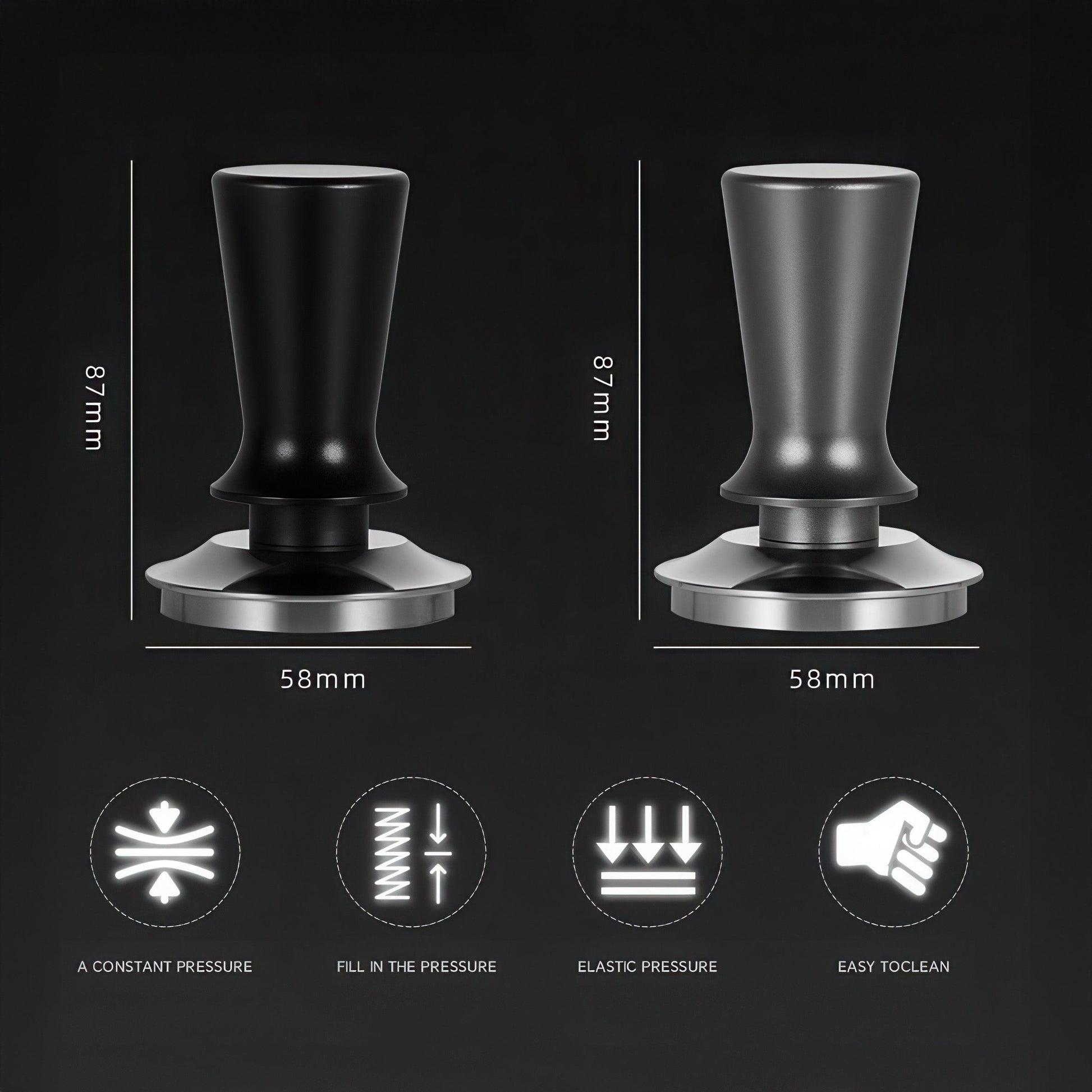 Water Level Constant Pressure Tamper: SUS304 stainless steel and aluminum materials (58mm spiral bottom, 87mm height) in Silver with automatic leveling, elastic pressure application, and ergonomic handle design for consistent professional results.